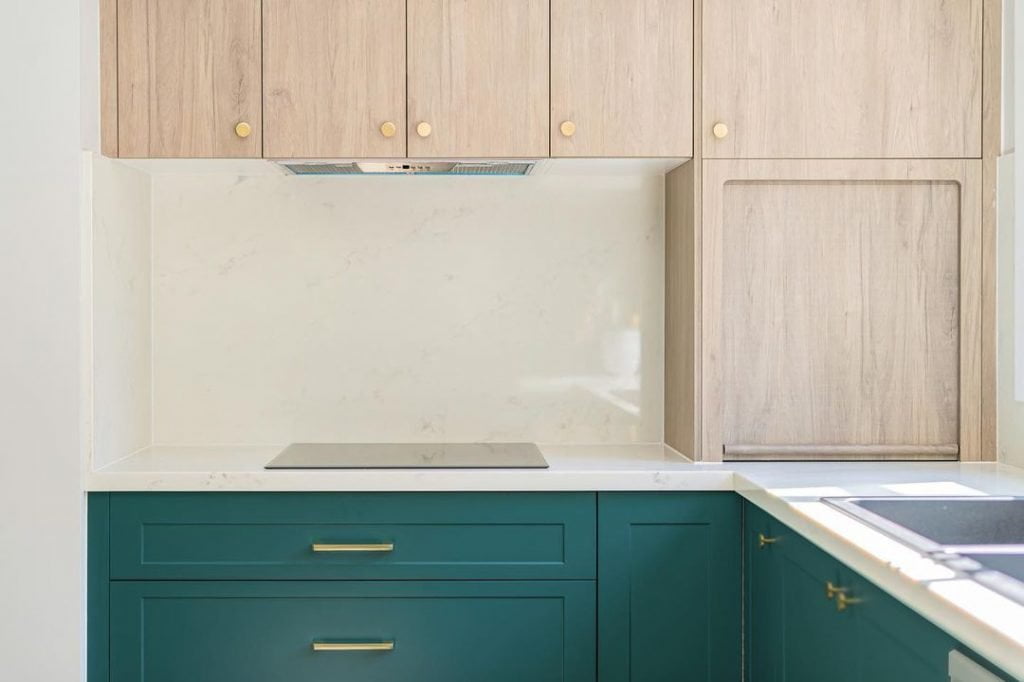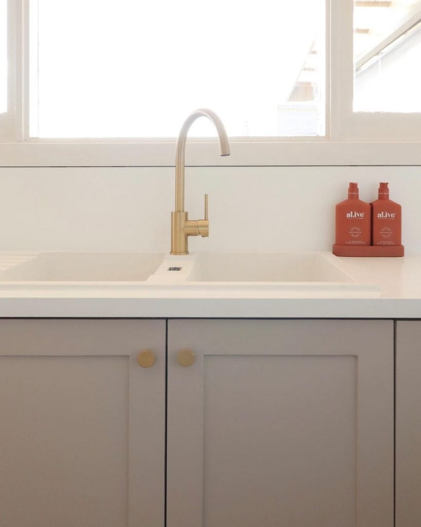 The sink was the most expensive part of our DIY kitchen renovation, but the difference it’s made is so worth it. We chose to top mount it so we didn’t need to replace the existing benchtop. The double bowl was slightly larger, so we shaved down the benchtop a little to make it fit. Thankfully, the plumbing was pretty easy to line up too. How to replace the rest of our handles and tapware in brushed brass
