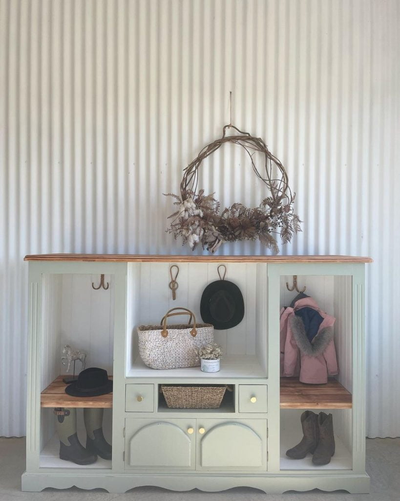 And just like that, an old tv cabinet has had a second lease on life! Nobody uses these old cabinets anymore as the tvs just kept on getting bigger so this beauty has been revamped into a self contained mud-room!