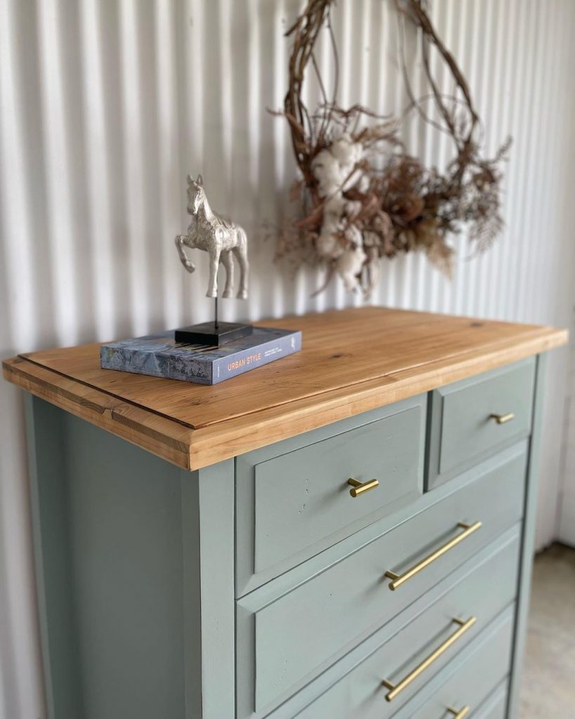 I absolutely love the combination of this set of draws.. from the raw top to the sleek handles to the beautiful custom mix colour of ‘Sage’ and ‘French Blue’ by @joliepaints this piece gave me all the feels